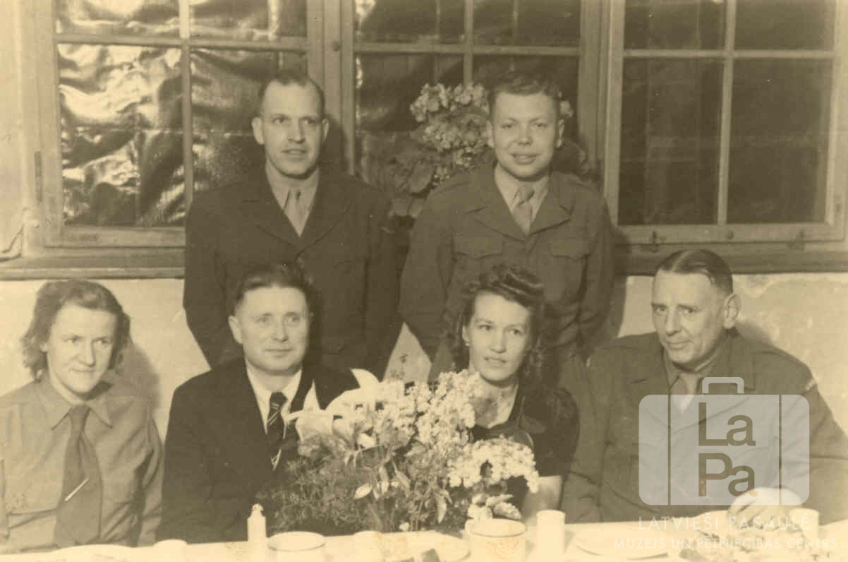 Peteris Banders ar kundzi un Centrālās nometnes Vircburgā (amerikāņu zonā) amerikāņu administrāciju 1945. gada rudenī. Priekšā četri cilvēki sēž pie galda, otrajā rindā stāv divi vīrieši. Uz galda ir ēdienu trauki un ziedi vāzē. Fonā logs. Priekšā, no kreisās: nezināms, Pēteris Banders (diriģents), Lonija Bandere un ? Hunts (nometnes direktors). Foto autors: J. Kreilis.