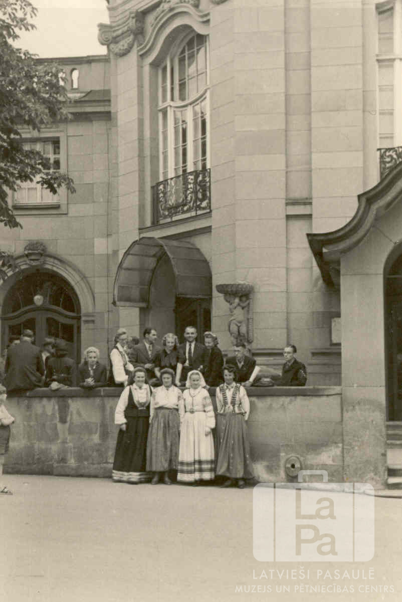 Latviešu jauktais koris no Centrālās nometnes Vircburgā (amerikāņu zonā) pie Badkissingenes operas nama. Sievietes ir ģērbušās tautastērpos, vīri – uzvalkos. Priekšā četras sievietes stāv pie zema mūra. Foto autors: J. Kreilis.
