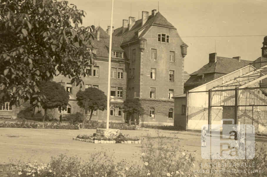 Skats Centrālajā nometnē Vircburgā (amerikāņu zonā). Redzams karoga laukums un puķu dārzs, aizmugurē nometnes ēka Nr. 5. Priekšplānā trīs meitenes spēlējas. No kreisās: otrā Biruta Bandere un trešā Biruta Ķīsis.