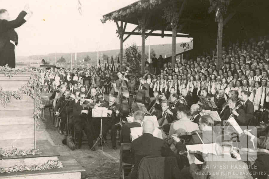 Dziemu dienu kopkoris un orķestris pirmo Vispārējo latviešu Dziesmu svētku 75 gadu atceres dziesmu svētkos Fišbahas nometnē (amerikāņu zonā). Priekšplānā, kreisajā pusē, uz paaugstinājuma stāv diriģents, vidū spēlē orķestris, bet labajā pusē uz estrādes trepēm, zem jumta, dzied koristi. Sievietes ir ģērbušās tautastērpos. Fonā skatītāji ar Latvijas karogiem un pauguraina ainava. Pirmais no kreisās: Pēteris Banders (virsdiriģents).