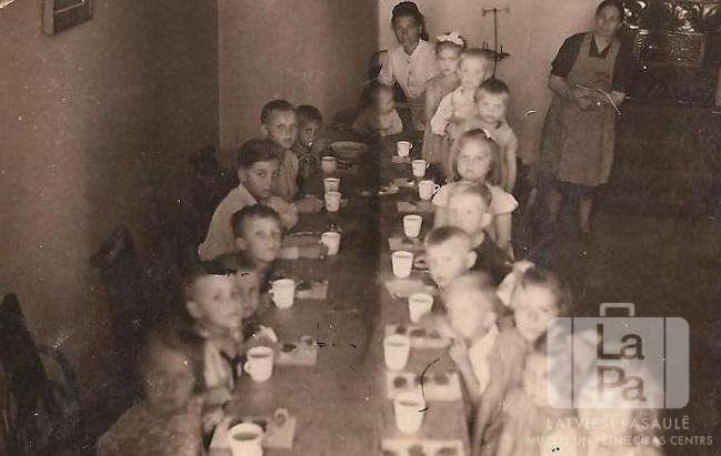 Bērnudārza bērni launaga laikā Altetingā (amerikāņu zonā). Bērni sēž abās galda pusēs. Uz galda ir dzērienu krūzes un trauki ar ēdienu. Galda galā stāv divas sievietes. Labajā galda pusē, pirmā no labās: Ludmila Stīvriņa. Galda galā stāv Ņina Visockis (gaišā apģērbā). Par šo gadījumu Ludmila Stīvriņa atceras: "Es esmu pirmā labā pusē. Mana tante Ņina Visockis, onkuļa Brencis māsa, stāv galda galā. Mēs šeit ēdam launagu – cepumus un dzērienu."