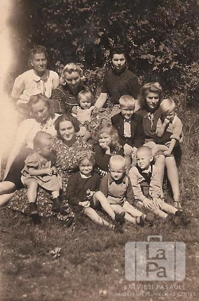 Bērnudārza bērni ar skolotājām sēž zālē Altetingā (amerikāņu zonā). Otrajā rindā, vidū, ir redzama Ludmila Stīvriņa (ar roku zem zoda). Viņai labajā pusē ir Andrejs Tauriņš (tumšā apģērbā), nezināms (skolotāja), Ilze Tauriņa (sēž skolotājai klēpī).