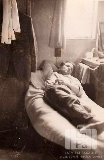 Pēteris Vansovičs guļ gultā istabā Neietingas nometnē (amerikāņu zonā). Priekšā, kreisajā pusē, uz pakarināmā karājas krekls un žakete. Gultas galā ir galds ar krūzi, dvieli un spoguli, virs galda ir logs.