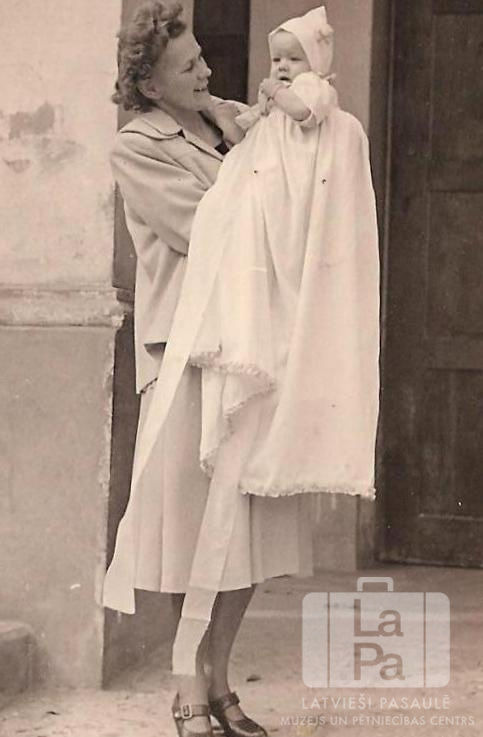 Ludmila Stīvriņa ar krustdēlu kristību dienā Valkas nometnē Nirnbergā (amerikāņu zonā). Fonā ēka. No kreisās: Ludmila Stīvriņa, Juris Popovs.