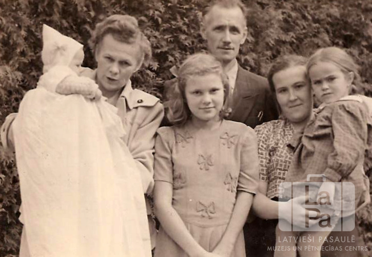 Popovu un Stīvriņu ģimenes Jura Popova kristību dienā Valkas nometnē Nirnbergā (amerikāņu zonā). Fonā dzīvžogs. No kreisās: Juris Popovs, Lidija Stīvriņa, Ludmila Stīvriņa, ? Popovs, ? Popova, Lidija Popova. Par šo gadījumu Ludmila Stīvriņa atceras: "Mēs fotografējāmies Jurīša Popova kristību dienā. Mamma viņam bija izšuvusi kristības apģērbu."