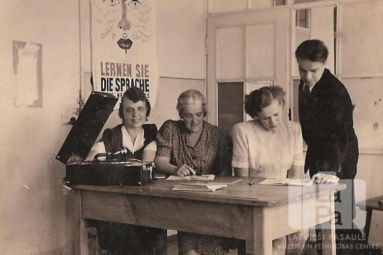 Angļu valodas stunda Memmingenes nometnē (amerikāņu zonā). Trīs sievietes sēž pie galda, uz kura ir plašu atskaņotājs. Labajā pusē pie galda stāv jauns vīrietis. Kreisajā pusē virs galda ir plakāts ar tekstu vāciski: "LERNEN SIE / DIE SPRACHE". No kreisās: ? Sanseviča, ? Gabar, Lidija Stīvriņa un nezināms.