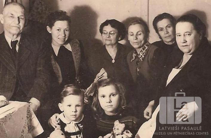 Dzimšanas dienas svinības Memmingenes nometnē (amerikāņu zonā). Divi bērni priekšā, seši pieaugušie aizmugurē. Priekšā, no kreisās: Pēteris ? un Ludmila Stīvriņa. Otrā no kreisās: nezināms (Pētera māte).