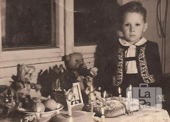 Pēteris ? bērnībā savā dzimšanas dienā ar kliņģeri un dāvanām Memmingenes nometnē (amerikāņu zonā). Uz kliņģera ir aizdegtas sveces. Kreisajā pusē ir logs.