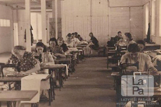 Šūšanas fabrika Memmingenē (amerikāņu zonā). Sievietes sēž pie šujmašīnām divās solu rindās. Labajā pusē, piektā: Lidija Stīvriņa. Par šo gadījumu Ludmila Stīvriņa atceras: "Šitā ir šūšanas fabrika, kur mamma strādāja un šuva pidžamus. Mamma arī mums pašiem šuva drēbes. Ja viņa saņēma lietotas drēbes, viņa no tām izšuva mums ļoti skaistas kleitas."