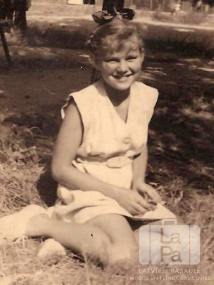 Ludmila Stīvriņa sēž zālē Memmingenē (amerikāņu zonā). Meitenei ir gaiša kleita, matos – tumša lente.