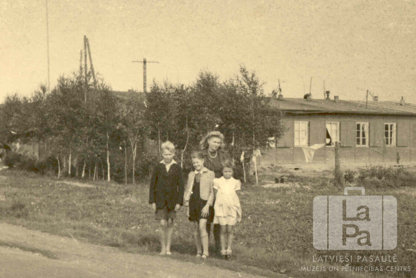Sieviete ar trim bērniem ceļa malā Lādes nometnē (angļu zonā) 1946. gada vasarā. Fonā ir krūmi un koka barakas. Priekšā, no kreisās puses: nezināms, Lilija Lepše un Maiga Buša (pr. Friess). Par šo gadījumu Maiga Friess (dz. Buša) atceras: "Lādes DP nometne bija mazā Lahdes pilsētiņā pie Vesseras upes, pretim no Petrshagenas pilsētas Vestfalijas provincē. Aizmugurē ir redzamas koka barakas, kas bija mūsu mājas trīs gadus."