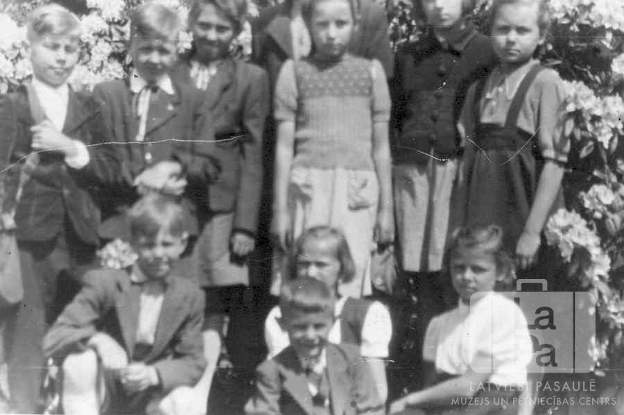 Bērnu grupa Lādes nometnē (angļu zonā) 1947. gada vasarā. Pirmajā rindā bērni tup uz zemes. Fonā ziedošs krūms. Priekšā, no kreisās: trešā Zane Jekste-Freivalde un ceturtā Maiga Buša (pr. Friess).