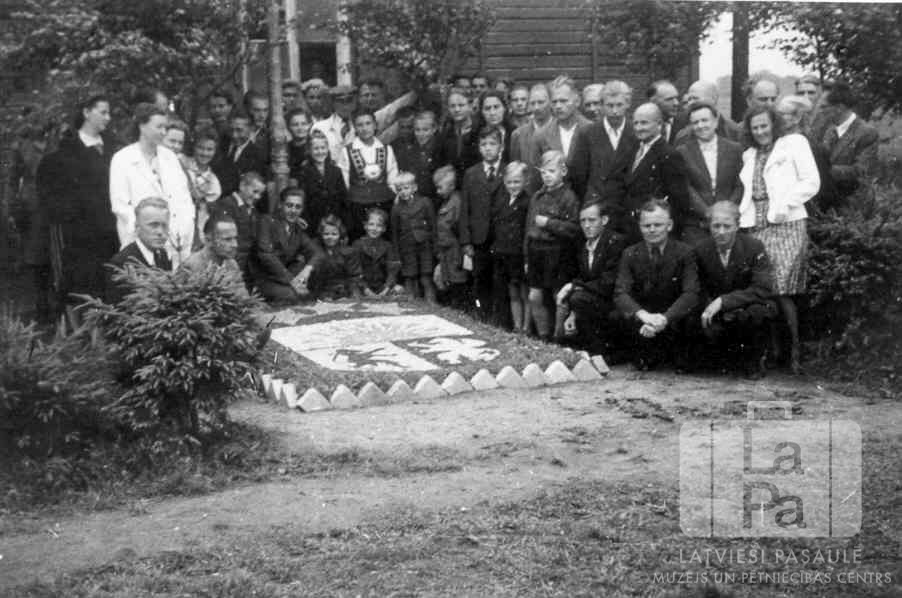 Liela cilvēku grupa sastājusies ap Latvijas ģerboni Lādes nometnē (angļu zonā) 1946. gada vasarā. Ģerboni uz zemes darināja nometnes mākslinieki un darbinieki, un tas atradās pie oficiālajiem ieejas vārtiem. Fonā koka baraka.