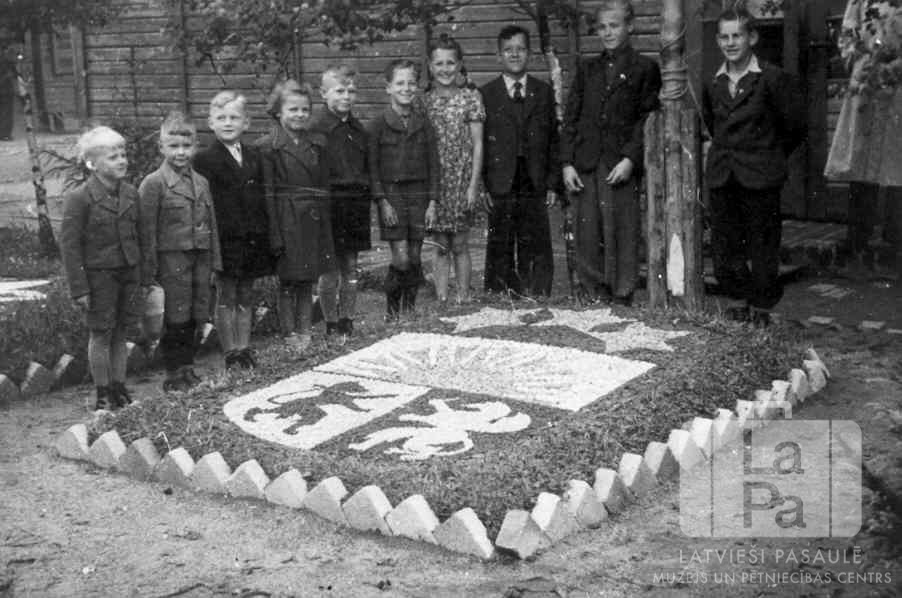 Bērnu rinda pie Latvijas ģerboņa Lādes nometnē (angļu zonā) 1946. gada vasarā. Ģerboni uz zemes darināja nometnes mākslinieki un darbinieki, un tas atradās pie oficiālajiem ieejas vārtiem. Fonā koka baraka. No kreisās: ceturtā Maiga Buša (pr. Friess), sestais? Lepše, septītā Lilija Lepše.