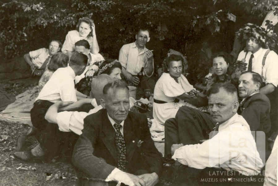 Cilvēku grupa sēž uz zemes pirmajos Jāņu svētkos Lādes nometnē (angļu zonā). Dažiem cilvēkiem galvās ir vainagi. Priekšā, pirmais no labās: Kārlis Bušs. Grupas vidū ir redzama Anastāsija Buša (gaišā kleitā). Par šo gadījumu Maiga Friess (dz. Buša) atceras: "Kaŗa briesmas jau bija vairāk kā gadu aiz muguras, latvieši kopā Lādes nometnē jau bijām nodzīvojuši gandrīz veselu gadu. Kāpēc gan nepapriecāties tipiski latviskā Jāņu un Jāņu dienā."