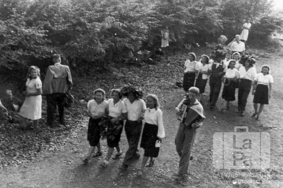 Cilvēki soļo divās rindās pirmajos Jāņu svētkos Lādes nometnē (angļu zonā). Blakus stāv skatītāji, aizmugurē ir krūmu rinda. Dažiem cilvēkiem galvās ir vainagi. Vīrietis blakus pirmajai rindai spēlē akordeonu. Par šo gadījumu Maiga Friess (dz. Buša) atceras: "Kaŗa briesmas jau bija vairāk kā gadu aiz muguras, latvieši kopā Lādes nometnē jau bijām nodzīvojuši gandrīz veselu gadu. Kāpēc gan nepapriecāties tipiski latviskā Jāņu un Jāņu dienā."