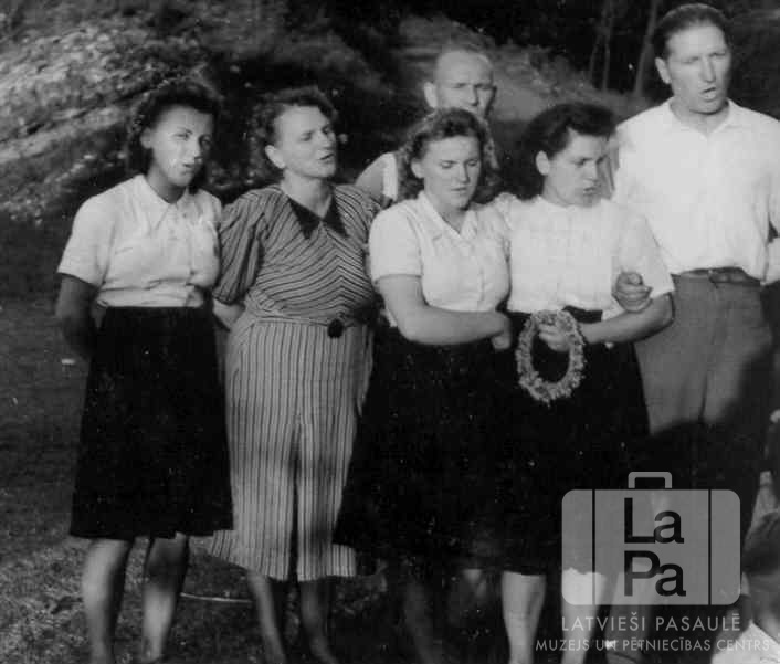 Cilvēku grupa dzied pirmajos Jāņu svētkos Lādes nometnē (angļu zonā). Vienai sievietei rokās ir vainags.