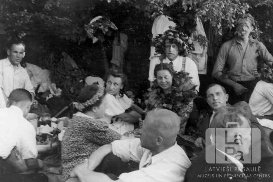 Cilvēku grupa sēž uz zemes pirmajos Jāņu svētkos Lādes nometnē (angļu zonā). Dažiem cilvēkiem galvās ir vainagi. Grupas vidū ir redzama Anastāsija Buša (gaišā kleitā).