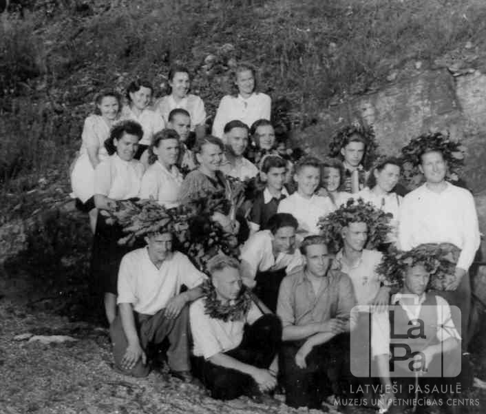 Cilvēku grupa pirmajos Jāņu svētkos Lādes nometnē (angļu zonā). Vairākiem cilvēkiem galvās ir vainagi. Fonā ir nogāze.
