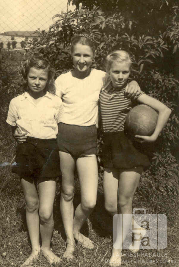 Trīs meitenes ar bumbu jauniešu sporta dienā Blombergas nometnē (angļu zonā) 1949. gada vasarā. Aizmugurē ir metāla sieta žogs, krūmi, aiz žoga lauks un tālumā ēka. No kreisās: pirmā Maiga Buša (pr. Friess) un Lilija Lepše.