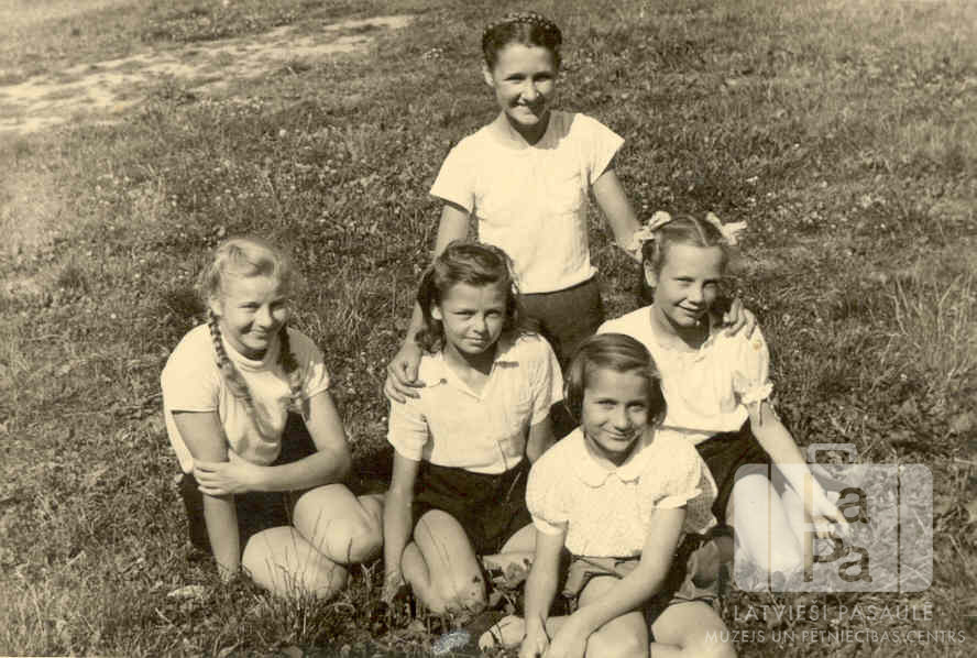Piecas meitenes sēž zālītē sporta dienā Blombergas nometnē (angļu zonā) 1949. gada vasarā. Priekšā sēž: Zane Jekste. Otrajā rindā, otrā no kreisās: Maiga Buša.