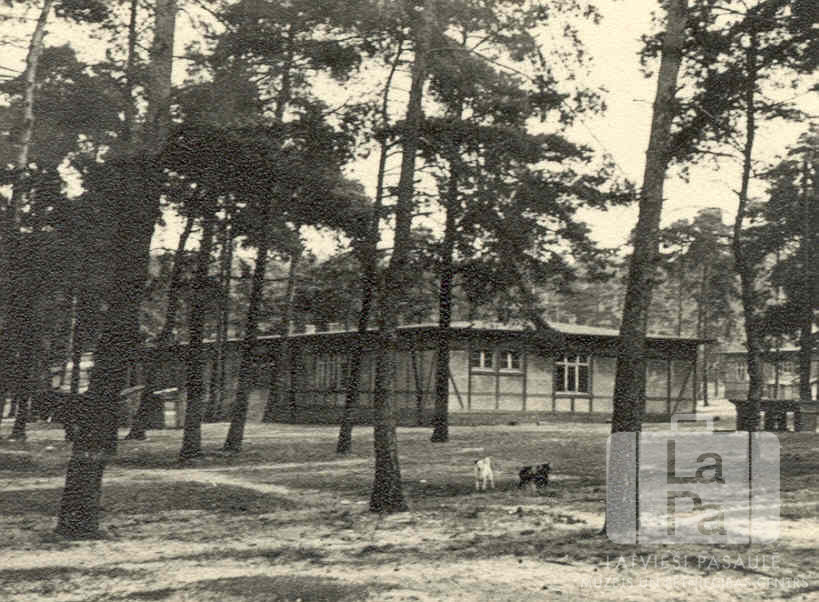 Skats uz vienstāvu barakām Augustdorfas nometnē (angļu zonā) 1950. gada rudenī. Priekšplānā atsevišķi augošas priedes, starp kokiem redzami divi suņi.