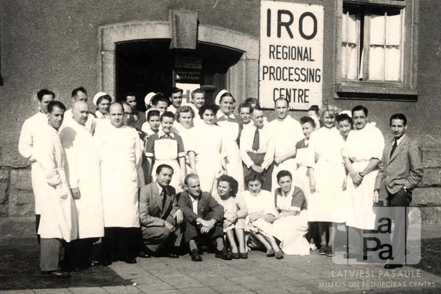 Cilvēku grupa baltos halātos pie organizācijas "International Refugee Organization" (IRO) ēkas ieejas Minsterē (angļu zonā) 1951. gada ziemā. Ieejas labajā pusē ir uzraksts: "IRO / REGIONAL / PROCESSING / CENTRE". Piektā no labās: Anastāsija Buša.