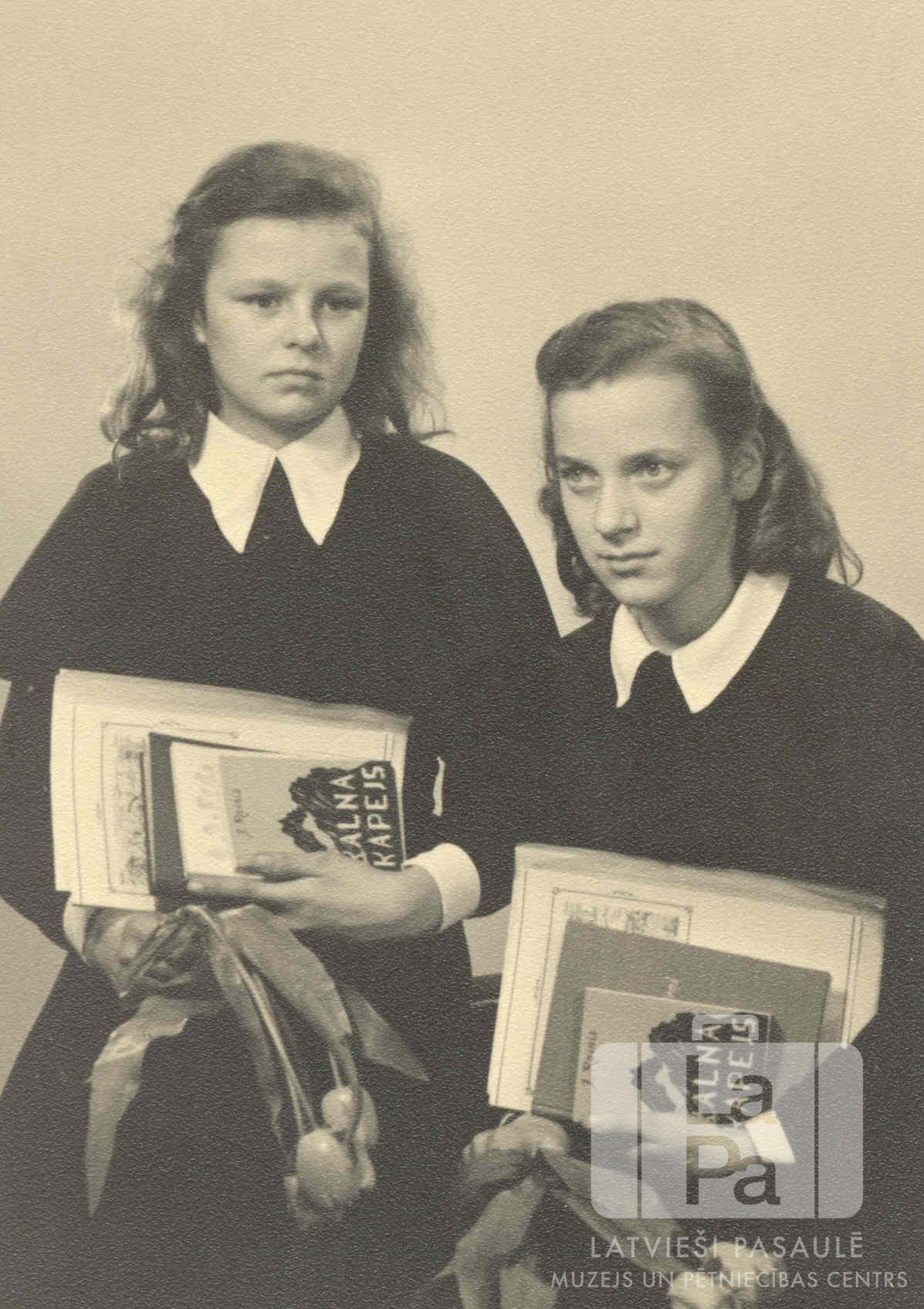 Divas latviešu tautskolas absolventes Augustdorfas nometnē (angļu zonā). Abām meitenēm rokās ir tulpes, grāmatas un dokumenti. Uz grāmatām ir uzraksts: "KALNĀ / KĀPĒJS". No kreisās: Maiga Buša (pr. Friess) un Inta Vanaga (?).