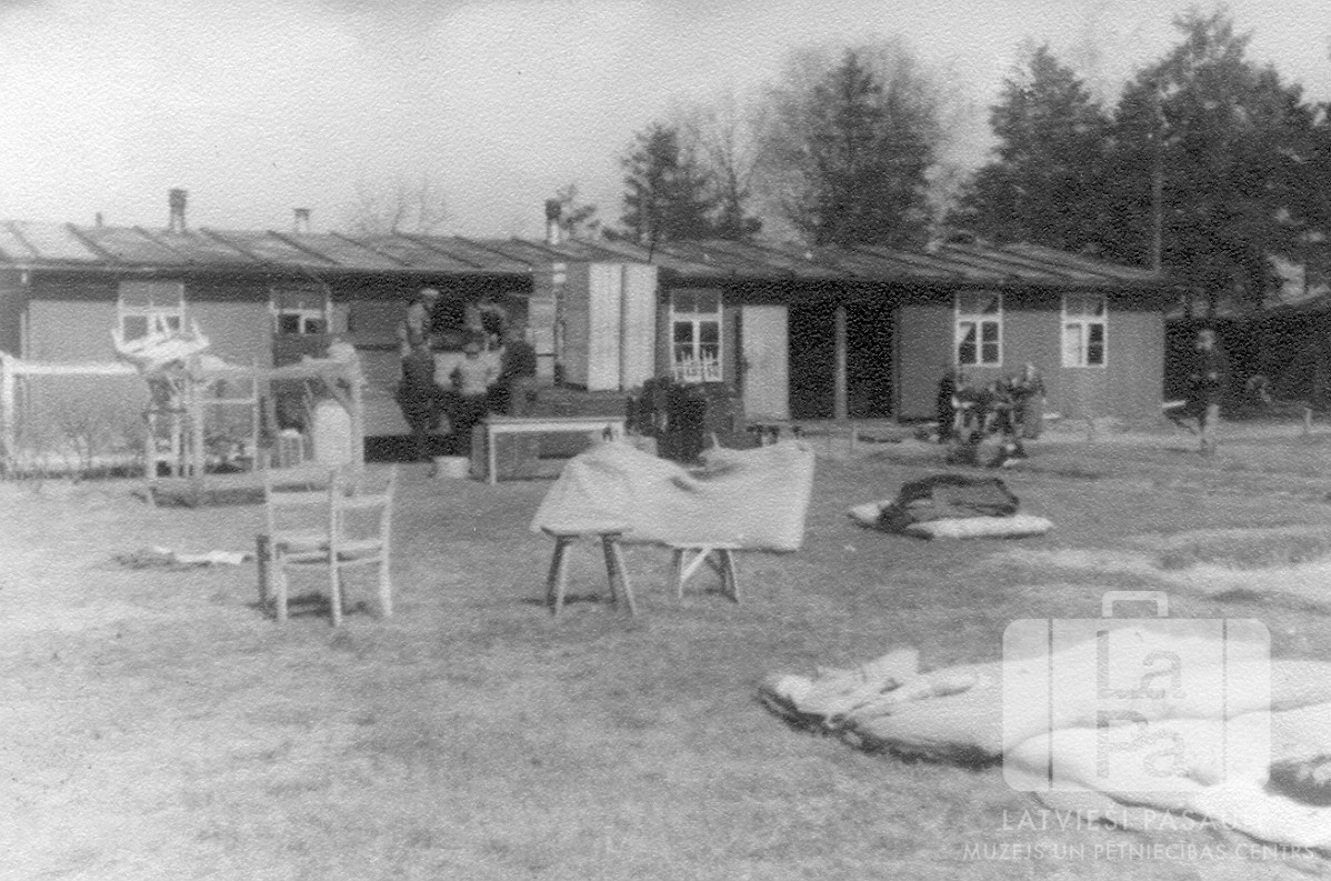 Skats uz pagalmu un vienstāvu koka barakām pārvākšanās dienās Elmsholrnas nometnē (angļu zonā) 1946. gada vasarā. Baraku priekšā ir izvākti krēsli, ķeblīši, galdi un arī dūnu segas. Pie baraku atvērtajām durvīm ir redzami cilvēki.