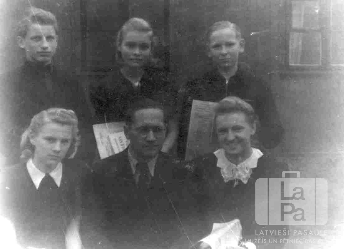 Pamatskolas absolventi ar skolotāju Elmshornas nometnē (angļu zonā) 1947. gada pavasarī. Seši jaunieši divās rindās, ar apliecībām rokās; pirmā rinda sēž. Fonā koka ēkas siena ar diviem logiem. Priekšā, no kreisās: pirmā Maija Zariņa (pr. Grosc), otrais: ? Ūsans (skolotājs). Par šo gadījumu Maija Grosc (dz. Zariņa) atceras: "Septītā klase jau bija sarukusi, jo vairākas ģimenes bija jau pārcēlušās uz citām nometnēm. Elmshornas nometni slēdza 1947. gada vasarā."