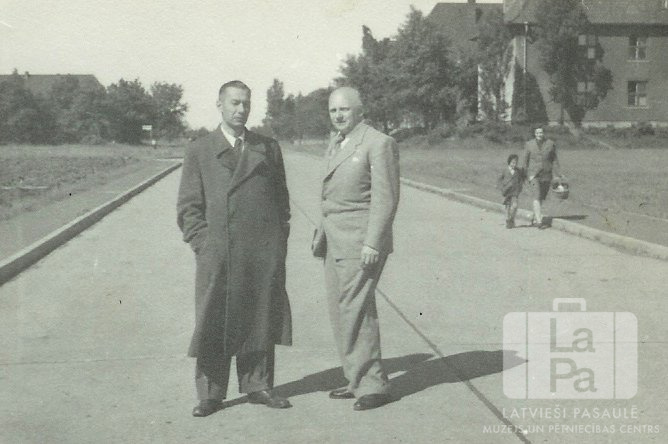 Latviešu administratori Pinnebergas nometnē (angļu zonā). Divi vīri stāv ceļa vidū. Aizmugurē, labajā pusē, ir redzama sieviete ar bērnu. Fonā caur kokiem ir redzamas vairākas mūra ēkas. No kreisās: Jānis Taube un Valentīns Zariņš.
