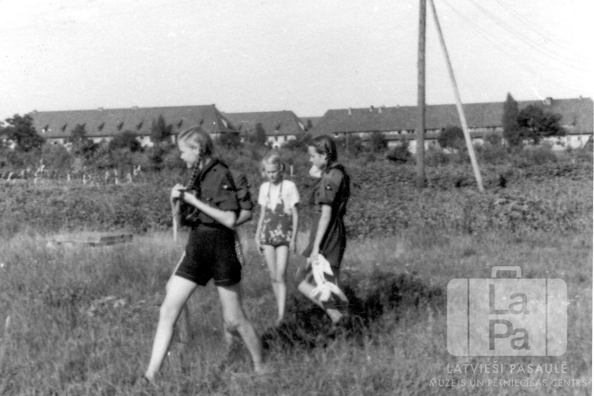 Četras gaidas āra nodarbībās laukos ap Pinnebergas nometni (angļu zonā) 1947. gada vasarā. Aizmugurē ir elektrības stabs un līnija; fonā ir nometnes vairākstāvu mūra ēkas, kurās darbojās Baltijas Universitāte. No kreisās: trešā Ruta Zariņa un ceturtā Maija Ābele.