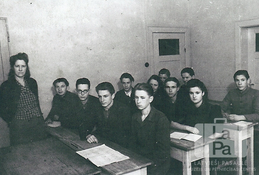 Pirmā vidusskolas klase Hokensbīlē netālu no Hūzumas (angļu zonā). Skolēni sēž trīs solu rindās, skolotāja stāv kreisajā pusē. Labajā pusē ir divas durvis. Pirmā no kreisās: ? Vēliņa (audzinātāja). Pirmajā solu rindā, no kreisās: otrais Andrejs Grava, trešais ? Neimanis. Otrajā rindā, no kreisās: Gunārs Noriņš, Astrīda Lejnieks, nezināms, Tatjāna Ābols. Trešajā rindā, no kreisās: Ilgonis Pīlāgs, nezināms, Jānis Slempers.