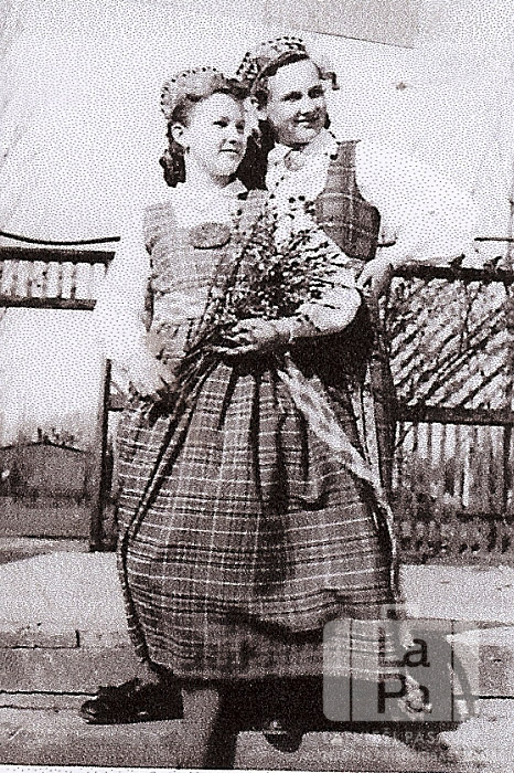 Divas jaunietes tautastērpos Vīnertas nometnē pie Hūzumas (angļu zonā), gatavojoties Lieldienām. Viena jauniete rokās tur pūpolus. Fonā žogs un ieejas vārti. No kreisās: Maija Noriņa (pr. Ikstruma), Inese Šulcs.