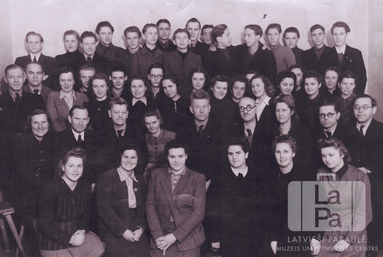 Skolēni un skolotāji Hokensbīles ģimnāzijā netālu no Hūzumas (angļu zonā). Liela cilvēku grupa vairākās rindās. Pēdējā rindā, labajā pusē ir redzams Gunārs Noriņš.