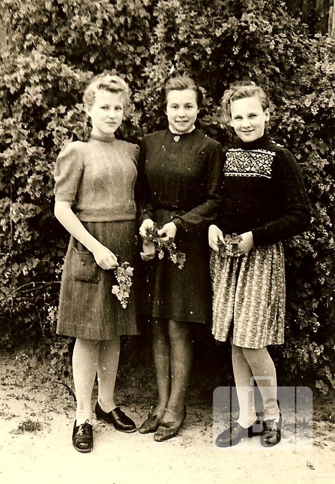 Trīs jaunietes pie ziedoša krūma Hūzumā (angļu zonā) 1947. gada pavasarī. Jaunietes tur rokās norautus, mazus, ziedošus zarus. No kreisās: Maija Noriņa (pr. Ikstruma), Mudīte Lūse, Inese Šulcs.