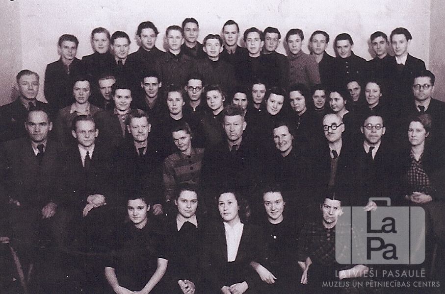Vidusskolas skolēni ar skolotājiem Hokensbīles nometnē pie Hūzumas (angļu zonā). Liela cilvēku grupa vairākās rindās iekštelpās. Otrajā rindā, piektais no kreisās: Eduards Ritmanis (direktors).