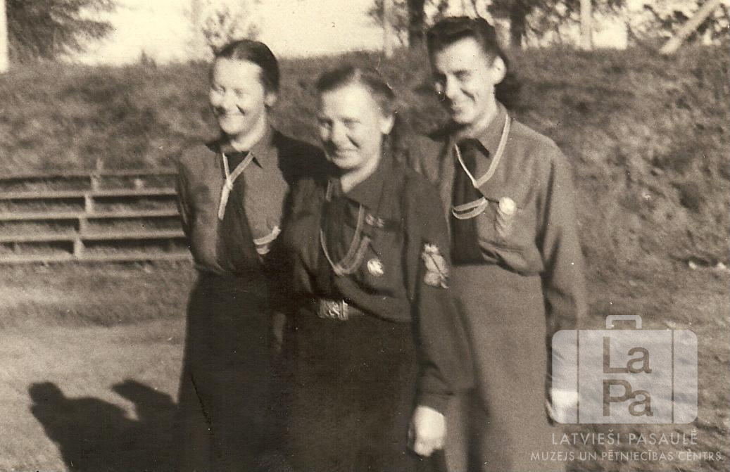 35. Gaujas vienības vadītājas formastērpos Vīnertas nometnē pie Hūzumas (angļu zonā). Iespējams, attēls ir uzņemts 1947. gadā Anterpes nometnē Flensburgā. Aizmugurē ir neliela nogāze ar solu rindu kreisajā pusē. Aiz nogāzes ir koki. No kreisās: Gaida Kalnāja, ? Elferte, Regīna Pavasara.
