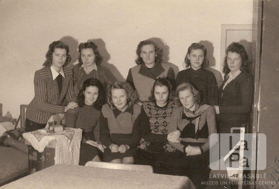 Pinnebergas vidusskolas (angļu zonā) 2. klases meitenes internātā. Telpā ir redzamas gultas un neliels galds. Pirmajā rindā, no kreisās: Genovēva Grieze, Aina Poriete, Biruta Upatniece, Ausma Rudzīte. Otrajā rindā, no kreisās: Rūta Grava, Mudīte Lūse, Inese Šulcs, Maija Noriņa (pr. Ikstruma), Dace Spīlberga.