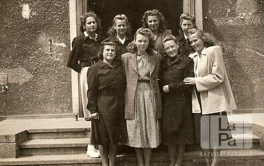 Astoņas Neištates vidusskolas (Holšteinā, angļu zonā) audzēknes uz mūra ēkas kāpnēm. Aizmugurē ir ēkas ieeja.