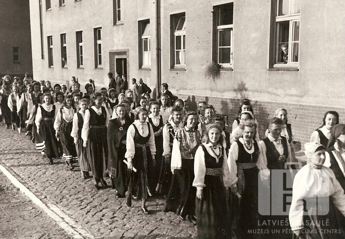 Gara sieviešu kolonna soļo gar mūra ēku Dziesmu svētkos Lībekā (angļu zonā). Gājienā bija arī Neištates vidusskolas grupa. Visas sievietes ir ģērbušās tautastērpos. Pie ēkas un ēkas logos garāmgājējās noskatās skatītāji.
