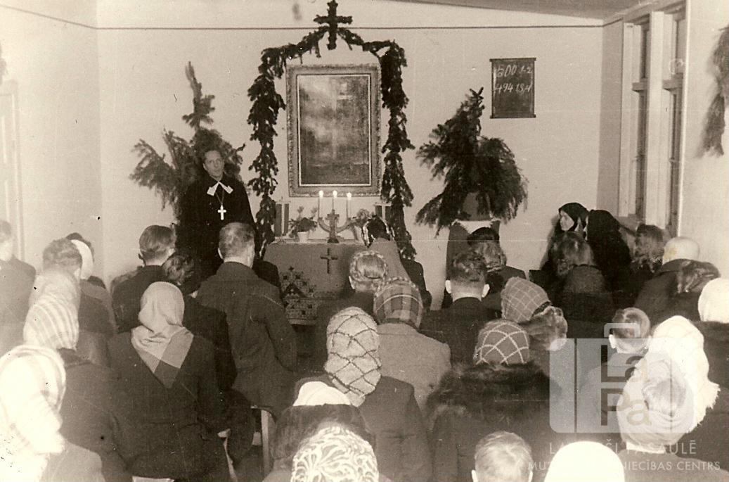 Dievkalpojums baznīcā Antverpes nometnē Flensburgā (angļu zonā). Priekšplānā ar mugurām pret fotogrāfu sēž apmeklētāji solu rindās. Apmeklētāju priekšā pie altāra stāv mācītājs amata tērpā. Uz altāra ir aizdegtas sveces svečturī, virs tā ir altārglezna. Siena virs altārglezna ir dekorēta ar egļu zariem.