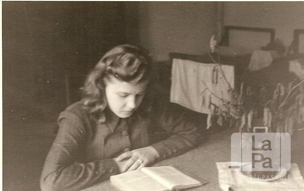 Maija Noriņa (pr. Ikstruma) pie mācību grāmatas Antverpes nometnē Flensburgā (angļu zonā). Jauniete sēž pie galda, uz tā ir grāmata un vāzē koka zari. Fonā ir istabas iekārtojums ar gultu.