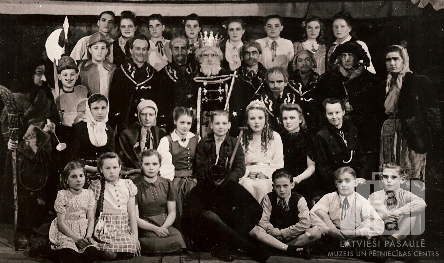 Liela aktieru grupa vairākās rindās teātra izrādē “Sprīdītis” Antverpes nometnē Flensburgā (angļu zonā). Cilvēki ir ģērbušies kostīmos, vairākiem tēliem ir sejas grims. Otrajā rindā, ceturtais no kreisās: Jānis Priedkalns (Sprīdīša lomas tēlotājs).