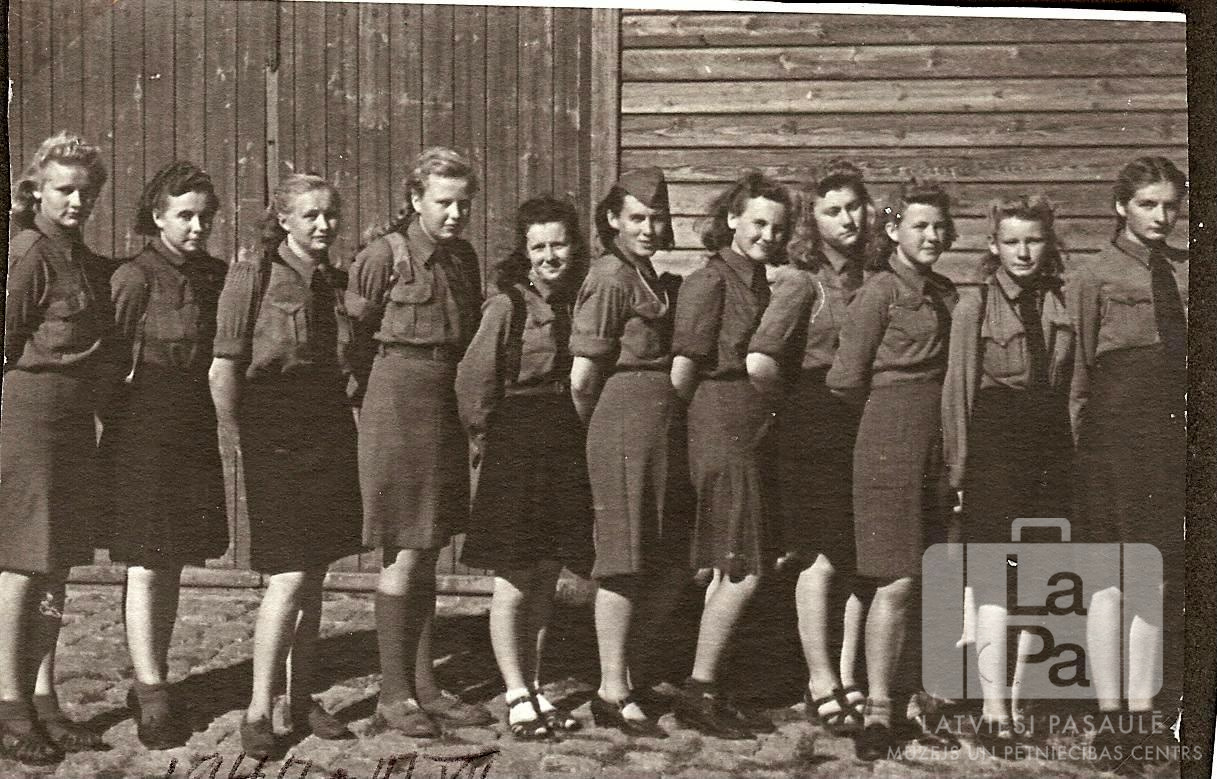 Gaidu ierinda formastērpos ceļā no Antverpes nometnes Flensburgā (angļu zonā) uz "Baden-Powell" gaidu nometni Timmendorfā. Fonā ir koka dēļu siena. No kreisās: Velta ?, Mudīte Lūse, Austra Miķelēna, Aina Poriete, Genoveva Greize, Regīna Pavasars (vadītāja), Inese Šulcs, Minjona Krūmiņa, Maija Noriņa (pr. Ikstruma), Ruta Priedkalne, Maija Grāvīte.
