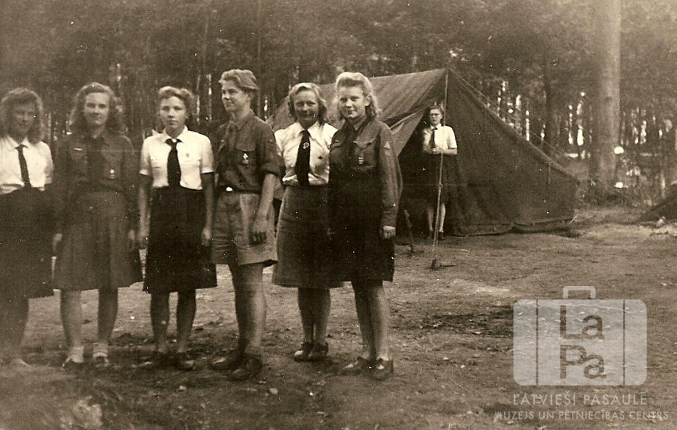 Sešas gaidas no Antverpes nometnes Flensburgā (angļu zonā) stāv rindā “Baden-Powell” gaidu-skautu nometnē Timmendorfā. Aizmugurē jauniete stāv lielas telts ieejā. Fonā ir mežs. Priekšā, no kreisās: Maija Noriņa (pr. Ikstruma), Inese Šulcs, Aija Raņķis, Mintauts Zvirbulis, Austra Miķelēna, Ruta Priedkalne.