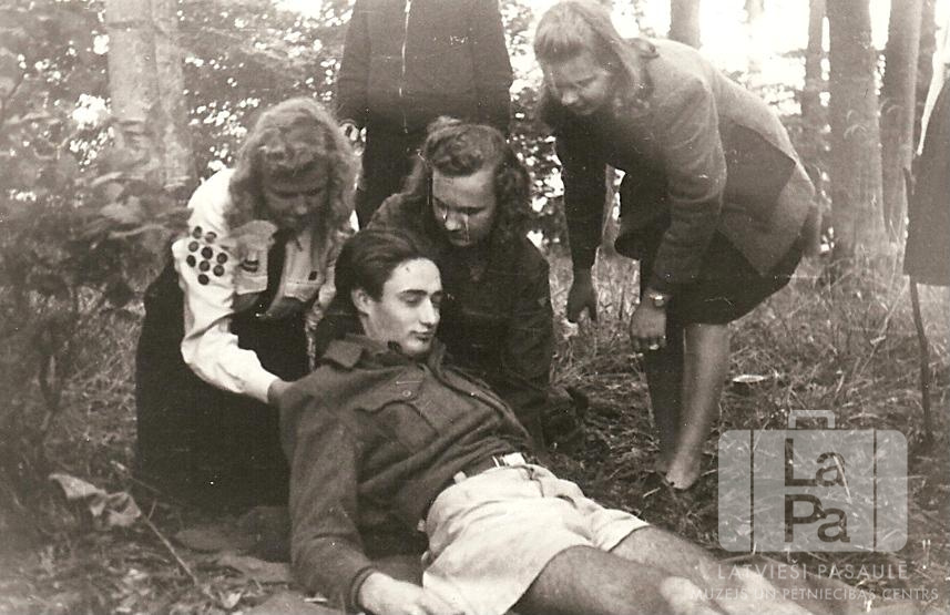 Praktiskā apmācība pirmās palīdzības sniegšanā skautiem un gaidām no Antverpes nometnes Flensburgā (angļu zonā). Viens puisis guļ uz zemes, divas jaunietes viņu stutē. Blakus stāv vēl vairāki jaunieši. Fonā mežs.