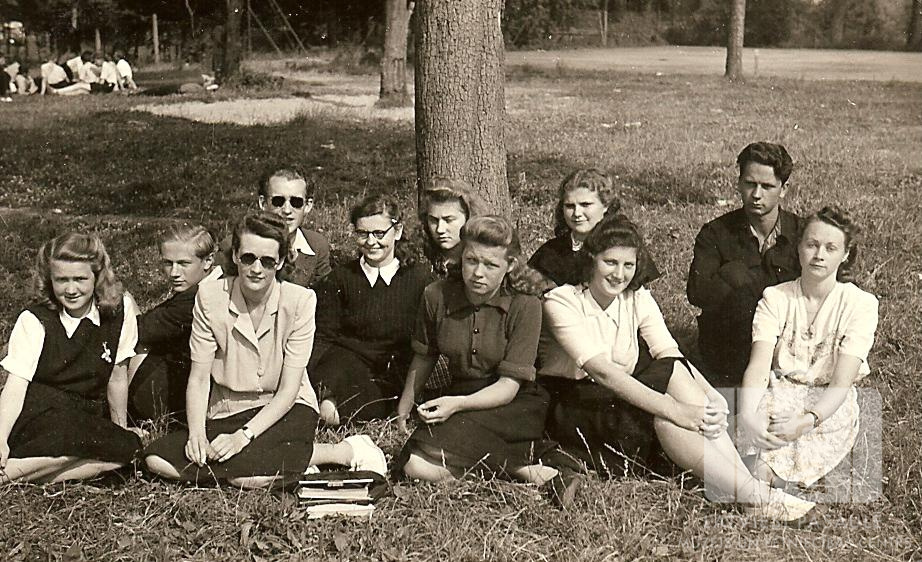 Ģimnāzijas 4. klases skolēni sēž zālē Neištatē (Holšteinā, angļu zonā). Fonā ir zālājs ar kokiem, kreisajā pusē ir tālumā redzama cita jauniešu grupa. No kreisās: pirmā Ilona Engels, otrais Ivars Dālbergs, trešā ? Pētersons (skolotāja), ceturtais Olafs Stumpis, sestā Minjona Krūmiņa, divpadsmitā Ausma Savels.