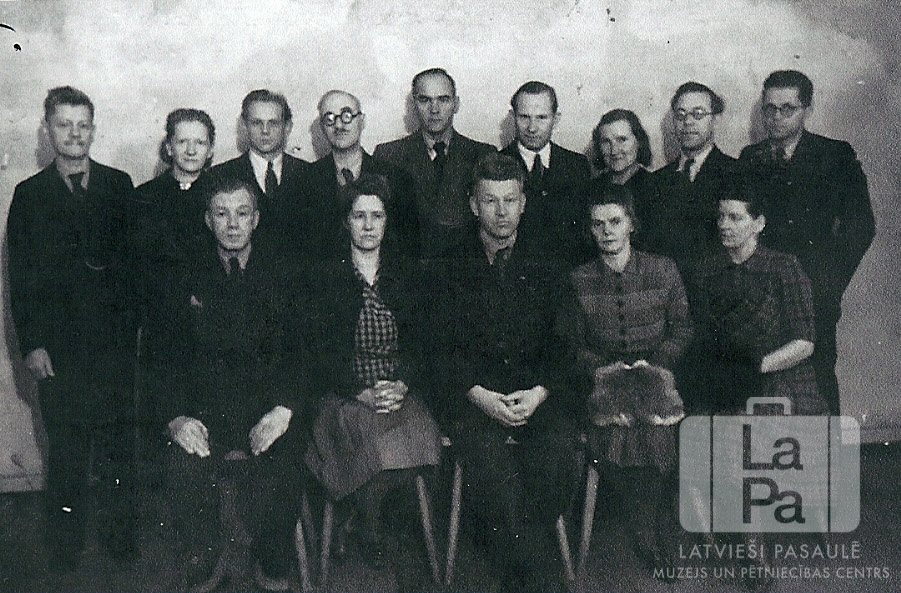 Skolotāji ar direktoru Hokensbīles nometnē pie Hūzumas (angļu zonā). Priekšējā rinda sēž uz krēsliem, aizmugurējā rinda stāv kājās. Pirmajā rindā, trešais no kreisās: Eduards Ritmanis (direktors).