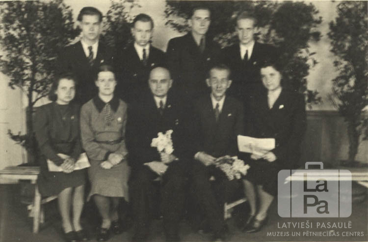 Jaunieši ar skolotājiem 4. klases izlaidumā Viestura ģimnāzijā Rēgensburgā (amerikāņu zonā). Priekšējā rinda sēž uz gara sola, aizmugurējā rinda stāv kājās. Fonā telpa ir izdekorēta ar augošiem kokiem podos. Pirmajā rindā, no kreisās: Ilga Upmane, Helga Muižniece, Vasilijs Balodis (direktors), R. Šillers (klases audzinātājs), Ingrīda Silvestra. Otrajā rindā, no kreisās: A. Ģipslis, A. Zutenis, J. Auniņš, Vilnis Ozols.